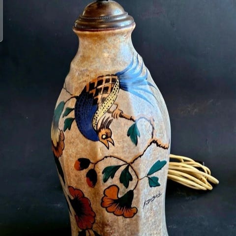 Denne stemningsfulde Art Deco bordlampe, formodentlig fremstillet i Italien omkring 1925-1940, viser en stiliseret Pierrot med guitar på en slebet alabast-sokkel. Hele lampen prydes af en opalglasbold i originale fitter. Sådanne lamper blev i mellemkrigstiden ofte håndlavede og er kendetegnende for den forfinede dekorative stil fra den tid. Oprindeligt blev denne type lampe anvendt som natlampe eller stemningslampe i saloner og boudoirer.