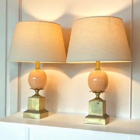 Stilfuld Maison Le Dauphin bordlampe med en base i imitation rødt marmor og guldfarvede accenter.