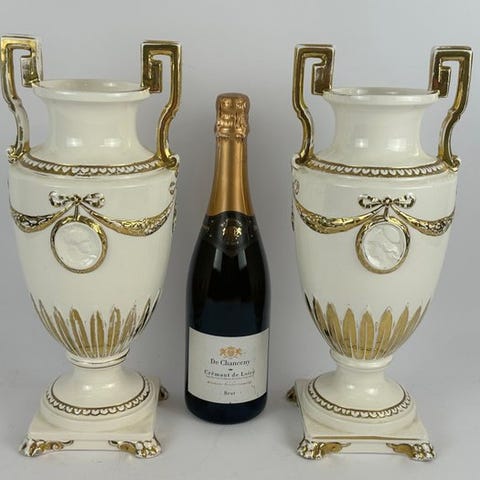 Et iøjnefaldende par store dekorative metalvaser, fremstillet af en metallegering (den nøjagtige sammensætning er ukendt), hver monteret på en drejet træfod. Vaserne ledsages af deres originale aftagelige indre metalkopper, designet til at placeres inde i vasernes kroppe.