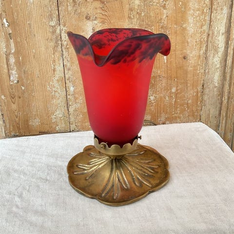 Glasbordlampe, designet af TIP efter Gallé, med iris- og blomsterdekoration på rødt glas med lyseblåt glas; cirka 36 cm høj og 16 cm i bredde; lavet i 1970–1980 i Frankrig; i fremragende stand og i funktion. Klik på den blå "gå til varen" knap, for at købe eller byde på denne vare. Den samlede pris vil blive vist inden du afgiver dit bud.