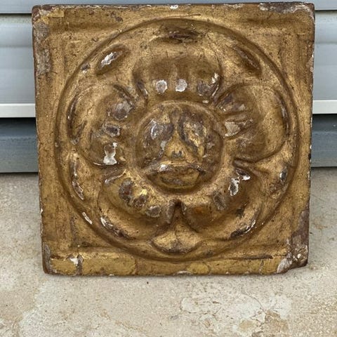 Indrammet udskåret træpanel, prydet med dekorative mønstre med roser og eleme...