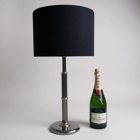 Stor troféelampe til bord i krommet metal, 72 cm høj, med sorte matchende lampeskærm, E27 fatning med afbryder og 140 cm ledning, fremstillet i Nederlandene, estimeret periode 1990–2000, i god brugt stand. Klik på den blå "gå til varen" knap, for at købe eller byde på denne vare. Den samlede pris vil blive vist inden du afgiver dit bud.