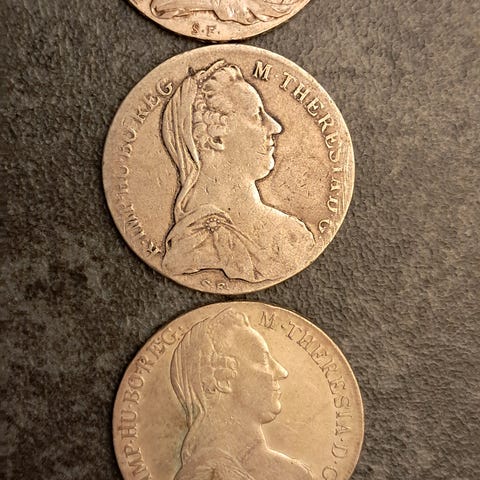 Sølvmønt kendt som Maria Theresa Taler, præget og distribueret i forskellige regioner og perioder som handelsvaluta. Forsiden forestiller et portræt af kejserinde Maria Theresa, mens bagsiden viser våbenskjoldet med den dobbelthovedede ørn.