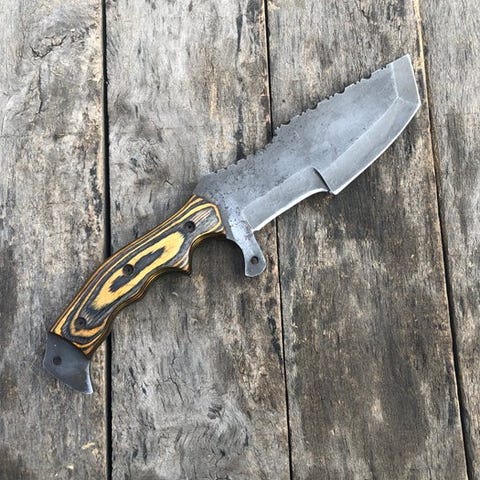 Dette er en bemærkelsesværdigt forarbejdet og håndfiksede køkkenkniv, fremstillet af de fineste knivmagere i USA. Dette er en meget flot håndlavet Prestigious Custom Handmade Skinners Knives, flerlags smedet stål, sjældent håndtag, læderskede. Kniven har et behageligt greb. Bladet er lavet af specielt smedet stål med en høj skærekant. Denne kniv er både et samlerobjekt og et nyttigt køkkenredskab. De længste knive har en ca. længde på 42 cm.