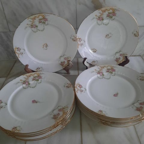 Pragtfulde tallerkener og ét serveringsfad af Limoges-porcelæn signeret af Raynaud.