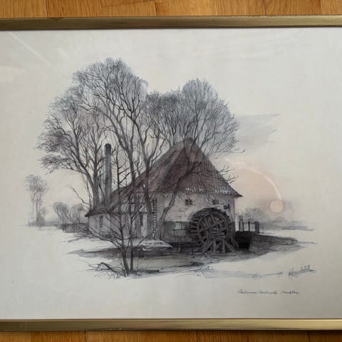 Dette er fra en serie med fire akvareller/tryk af danske vandmøller. De fire motiver er også fordelt på de fire årstider. Mener dette er "sommer"?