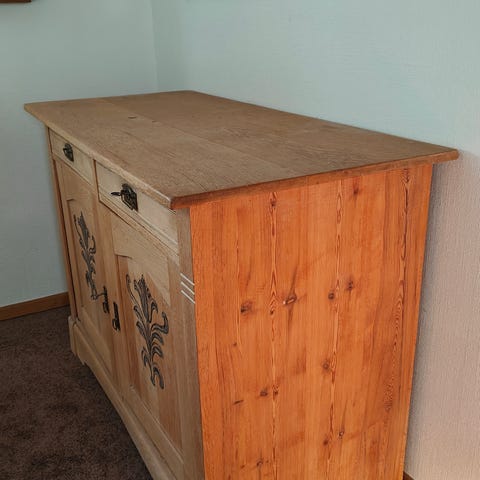 Egetræsstellet, udvalgt for sin soliditet og stabilitet, er fineret med ædle træsorter som bois de roise, mahogni, buksbom og valnød, der er mesterligt kombineret for at fremhæve træets naturlige åremønster. Fronten har håndtag i burl-medaljoner med forgyldte bronzeapplikationer, der harmonisk komplementerer frontfriserne, også i forgyldt