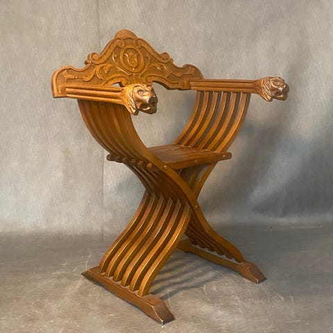 Savonarola-stol i træ fra Firenze, Italien, ca. 1950–1960, højde 91 cm, bredde 59 cm, dybde 53 cm, i god brugt stand med mindre aldersmærker og pletter. Klik på den blå "gå til varen" knap, for at købe eller byde på denne vare. Den samlede pris vil blive vist inden du afgiver dit bud.