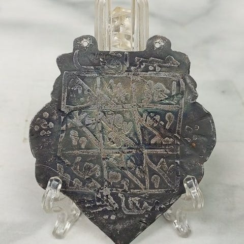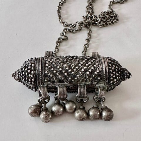 Oprindelse Oman, vedhæng med titlen 'Pendant. Borst of rug sierraad', lavet af sølv, vægt 166 g, 29 cm høj og 22 cm bred, dateret til omkring 1900–1950, i fremragende stand. Klik på den blå "gå til varen" knap, for at købe eller byde på denne vare. Den samlede pris vil blive vist inden du afgiver dit bud.