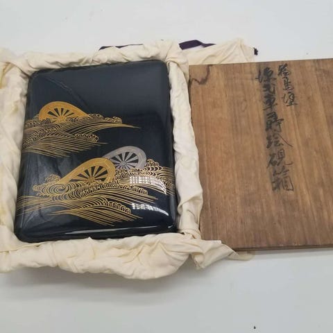 Wajima-lakeret træboks med chinkin gyld inlæg, 26×26×26 cm, fremstillet i Japan, i god stand med mindre tegn på ældning, skønnet periode 1960–1980. Klik på den blå "gå til varen" knap, for at købe eller byde på denne vare. Den samlede pris vil blive vist inden du afgiver dit bud.