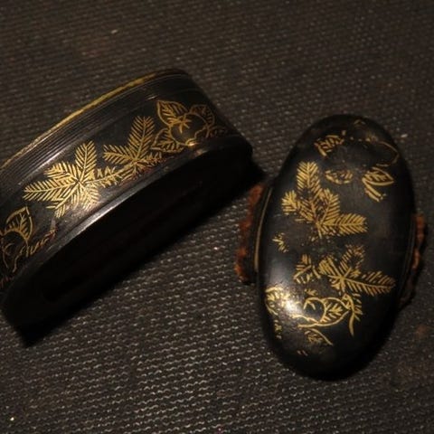 Sukashi tsuba af smedet jern fra Edo-perioden med guldbeslag, Daito Ume Tree Sukashi Tsuba, ingen tegningssignatur angivet, ca. 7,2 cm × 7,8 cm × 0,5 cm, og 100–160 g, fra Japan i rimelig stand. Klik på den blå "gå til varen" knap, for at købe eller byde på denne vare. Den samlede pris vil blive vist inden du afgiver dit bud.