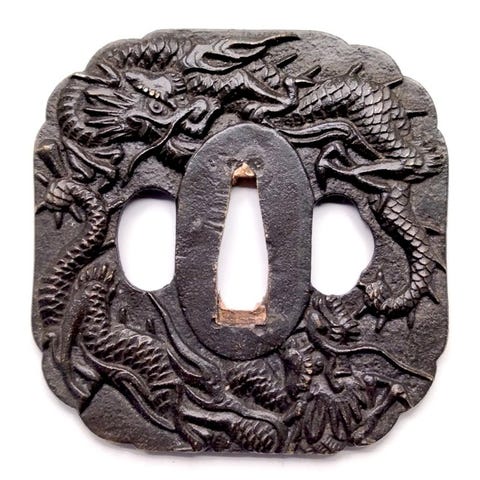 Drage- og tigerdesign med guld- og shakudoinlæg.