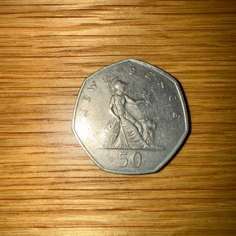Mynt af 6 pence med Dronning Victoria i hendes Guldjubelår, designet med hendes kronebårne buste på forsiden og våbenskjoldet på bagsiden, omgivet af Ordenen af Jomfru Marias motto.