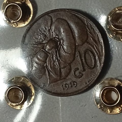 - Indskrifter: VITT • EM • III • RE • IMP • på forsiden med kongens profil til venstre; ITALIA på bagsiden med en symbolsk kvindelig figur med en lictor, værdi C.20, årstal 1940 og tallet XVIII.