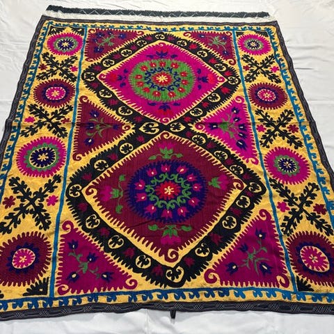 Oprindelse Uzbekistan, model Suzane Rug, Sofa Cover, Bed Cover, Wall Hanging; uld og silke på bomuld; flerfarvet; 245 cm x 140 cm; professionelt rengjort og i god stand med brugsspor. Klik på den blå "gå til varen" knap, for at købe eller byde på denne vare. Den samlede pris vil blive vist inden du afgiver dit bud.