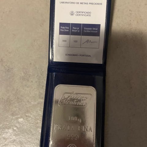Albino Moutinho sølvbar på 100 g, .999 finhet, med certifikat, leveret i sin egen beskyttende kasse. Klik på den blå "gå til varen" knap, for at købe eller byde på denne vare. Den samlede pris vil blive vist inden du afgiver dit bud.