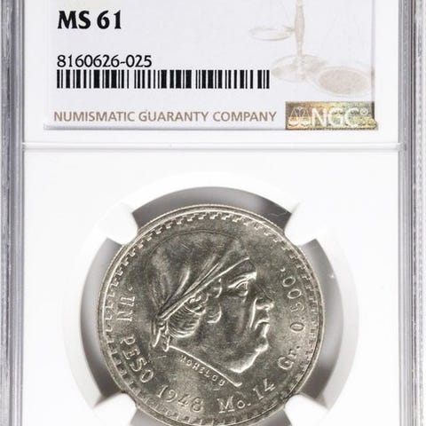 Mexico 25 pesos sølv commemorative mønt udstedt for Olympiske Lege i Mexico City 1968, renhed 0,720, forside med aztekisk danser og bagside med nationalemblem, bedømt som MS65 af NGC (certificeringsnummer MS65). Klik på den blå "gå til varen" knap, for at købe eller byde på denne vare. Den samlede pris vil blive vist inden du afgiver dit bud.
