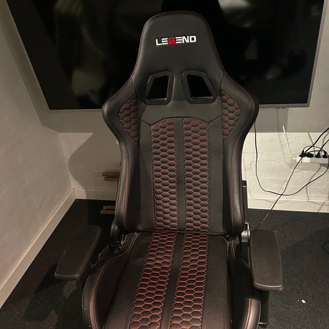Gaming stol i sort og rød farve med polstret sæde og ryglæn. Stolen har justerbare armlæn for individuel tilpasning. Egnet til brug ved skrivebord eller gaming setup.