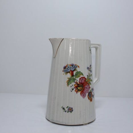Denne elegante antikke claretkande eksemplificerer den raffinerede æstetik fra det tidlige 20. århundrede, hvor flydende Art Nouveau-linjer kombineres med funktionelt skønhed. Stykket skiller sig ud med sin yndefulde silhuet og skulpturelle tilstedeværelse, hvilket gør det til både et dekorativt objekt og en praktisk serveringsgenstand.