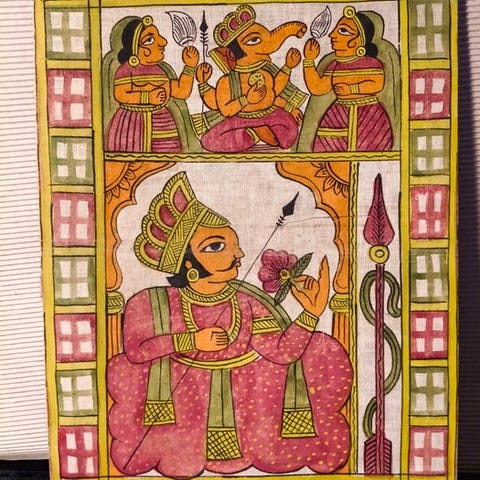 Par af to indiske Pichwai-malerier på bomuld, hver 80 x 50 cm, Indien, 20. århundrede, tilskrevet i stilen af, i stil med, i god stand. Klik på den blå "gå til varen" knap, for at købe eller byde på denne vare. Den samlede pris vil blive vist inden du afgiver dit bud.