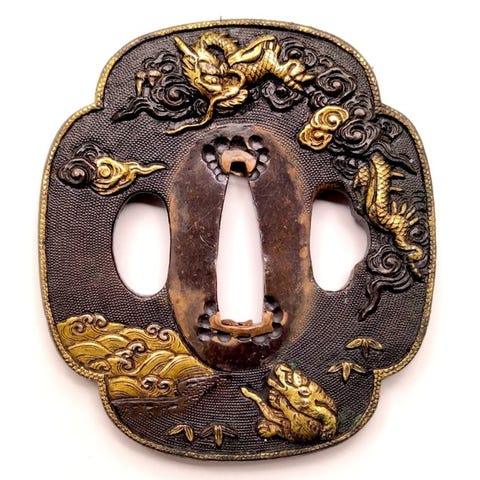 Fuchi kashira-sæt fra Edo-perioden i shakudo med tiger og bølger-design, underskrevet Kyohashi Noritsune, mål 35×19×11 mm, i meget god stand uden skader; afsendes fra Japan med tracking og forsikring og kan ikke sendes til Belgien. Klik på den blå "gå til varen" knap, for at købe eller byde på denne vare. Den samlede pris vil blive vist inden du afgiver dit bud.