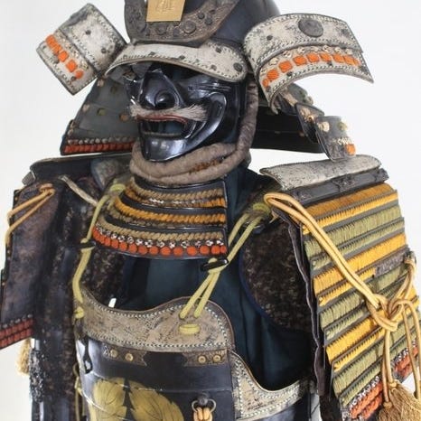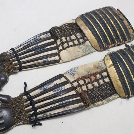 Set af kote, haidate og suneate af smedet jern fra Edo-perioden, sort lak, kote 68 × 19 cm, haidate 50 × 54 cm, suneate 30 × 30 cm; oprindelse Japan; omkring 200 år gammel; vægt 1,8 kg. Klik på den blå "gå til varen" knap, for at købe eller byde på denne vare. Den samlede pris vil blive vist inden du afgiver dit bud.