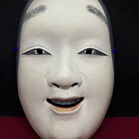 Sjælden høj kvalitet japansk traditionelt håndskåret træ Noh-maske - Masukami 増髪, fint udskåret med omhyggelige detaljer.