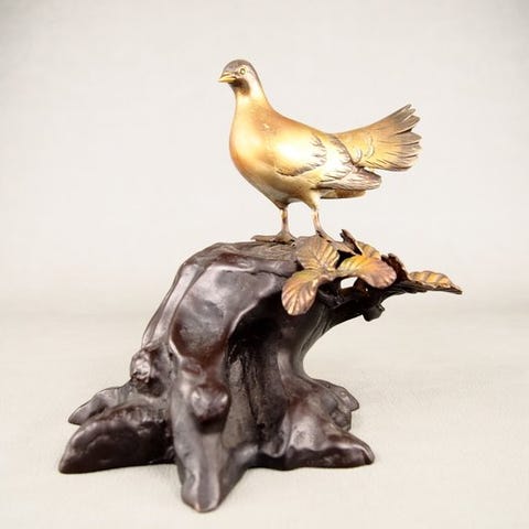 Meget forfinet japansk bronze okimono, der forestiller en bidsprinkhaan (kamakiri), naturtro gengivet. Den bidsprinkhaan er udført med bevægelige ben, vinger og fangarme, hvilket vidner om højt håndværk og teknisk præcision, kendetegnende for den japanske metalbearbejdning fra Meiji- eller Taishō-perioden.