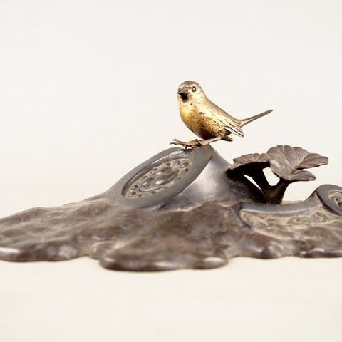 Japansk bronze okimono af en bidsprinkhaan med bevægelige dele, signeret, i meget god stand; målene: 3 cm høj, 9 cm bred, 2 cm dyb. Klik på den blå "gå til varen" knap, for at købe eller byde på denne vare. Den samlede pris vil blive vist inden du afgiver dit bud.