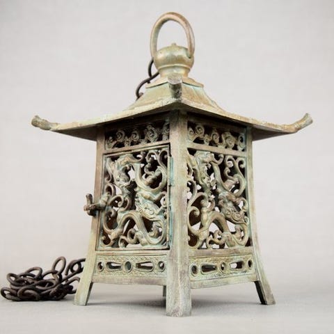 Hexagonalt jernlanterne fra Japan med bambus- og plumedesign, Meiji-perioden (omkring 1850–1930), ca. 36,3 cm høj, 30,6 cm bred, 33,8 cm dyb, vægt 7,6 kg, med aftagelige dele og ikke i funktion; generelt god stand med tegn på ælde. Klik på den blå "gå til varen" knap, for at købe eller byde på denne vare. Den samlede pris vil blive vist inden du afgiver dit bud.