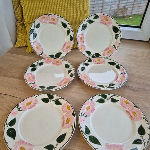 Seks tallerkener fra den populære serie 'Wildrose' af Villeroy & Boch. Tallerkenerne har en diameter på ca. 20,5 cm og egner sig som suppe- eller pastatallerkener. Håndmalet med rosa blomster, gul midte og grønne blade på cremefarvet bund. På undersiden er de mærket: Villeroy & Boch, Made in Germany, Håndmalet, opvaskemaskinefast.