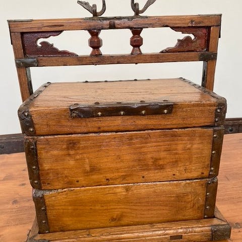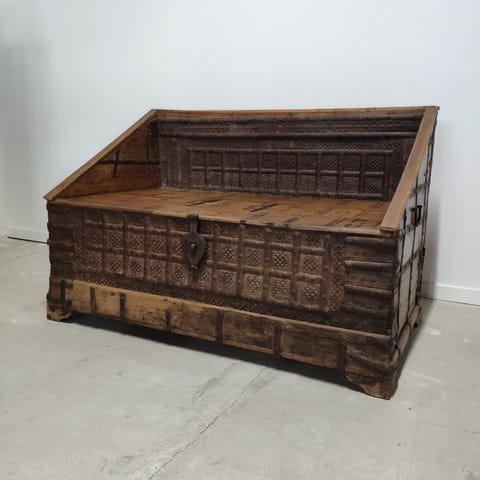 Kerala bryllupskuffe, polykromt lakeret træ med smedede jernbeslag, Indien, 19. århundrede, dimensioner 26 × 20 × 16,5 cm, provenance fra antikmarkedet, i god stand, indvendigt lille rum med låselåg mangler og ydre lås mangler nøgle, alderdomstegn og restaureringer. Klik på den blå "gå til varen" knap, for at købe eller byde på denne vare. Den samlede pris vil blive vist inden du afgiver dit bud.