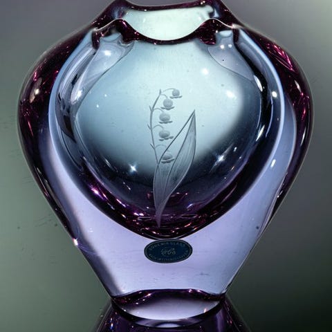 Eosin-glasuren giver keramikken et tydeligt iriserende, metallisk udseende, der ændrer sig med lys og perspektiv.