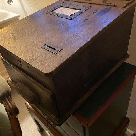 Metalkasse med træskuffe fra det belgiske mærke Het Anker, oprindelse Bruxelles, Art Deco-stil, i rimelig brugt tilstand med mulig manglende smådele, dimensioner 60 × 47 × 47 cm. Klik på den blå "gå til varen" knap, for at købe eller byde på denne vare. Den samlede pris vil blive vist inden du afgiver dit bud.