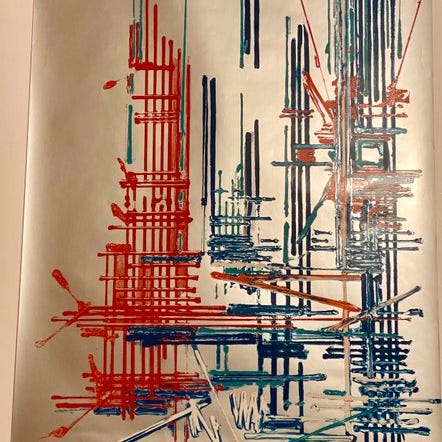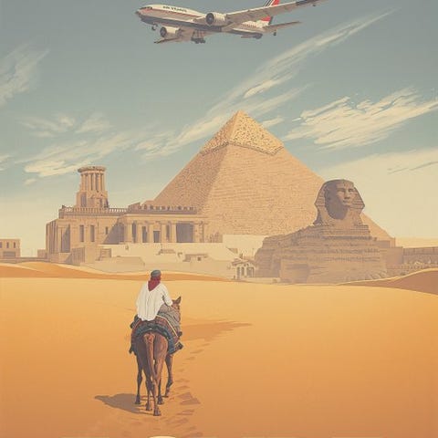 En meget smuk plakat fra Air France Museums samling: Verdenskort over langdistancenetværk med smukke farver og mange figurer og dyr i illustrationer.