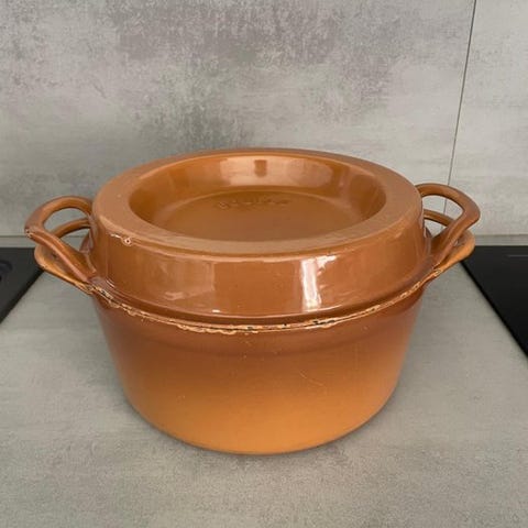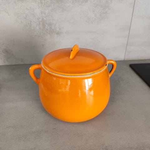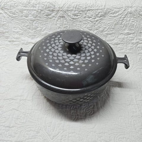 Grødetøj med låg, original Le Creuset, af emaljeret støbejern. God vintage stand, se billeder.