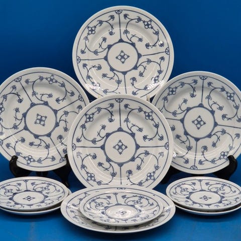 Til salg står et klassisk tallerken- og kopper sæt af porcelæn fra manufakturen Kahla.