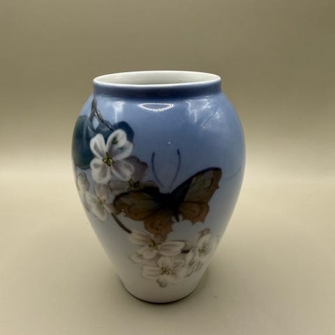 Dette er et udsøgt eksempel på dansk håndværk fra det verdensberømte Royal Copenhagen. Denne vintage porcelæns vase har en delikat, håndmalet blomsterudsmykning ledsaget af et charmerende bi/insekt-detalje, et kendetegn ved mærkets naturinspirerede æstetik.