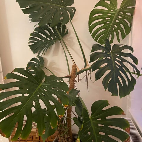 Monstera plante med store grønne blade, +10 årh gammel. Planten har karakteristiske huller i bladene og er velegnet som dekorativ stueplante. Krukken følger ikke med