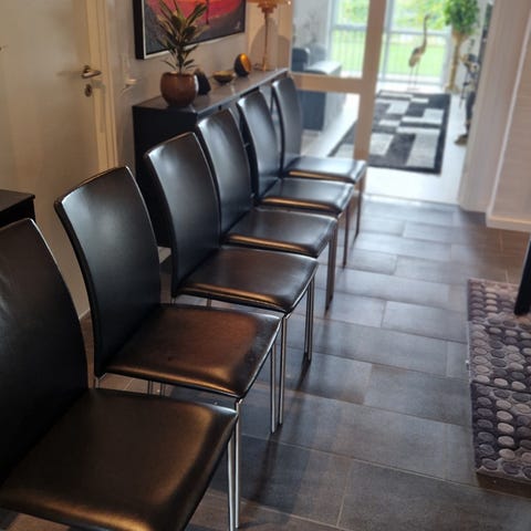 Skovby sm59 i sort læder i fantastisk flot stand. 6 stk haves. En stol du kan sidde i en hel aften. Okselæder.