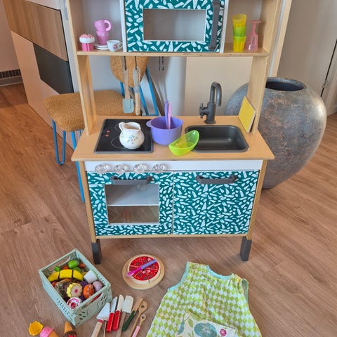 IKEA legekøkken til børn inklusive forskellige tilbehør som legetøjsmadvarer og køkkenredskaber i træ og plastik.