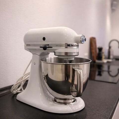 KitchenAid Artisan røremaskine i rød farve med rustfri stål skål og tilbehør bestående af piskeris og dejkroge. Maskinen er velegnet til blanding, æltning og piskning af forskellige ingredienser.