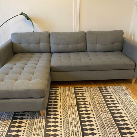 IKEA sofa i vinrød farve, 3 år gammel (ikke-rygerhjem). Se mål og flere billeder her: https://www.ikea.com/dk/da/p/smedstorp-3-pers-sofa-med-chaiselong-lejde-rod-brun-eg-s29418597/#content
