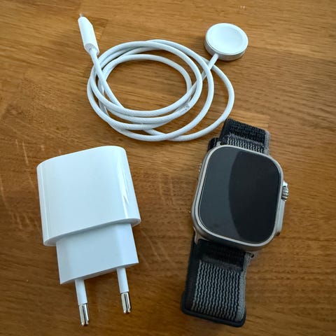 Apple smartwatch ultra til herre. Uret har en firkantet skærm og sensorer på bagsiden til måling af sundhedsdata.
