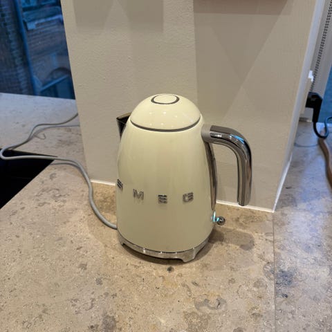 Smeg elkedel i mat hvid farve med krom detaljer. Designet med rund form og håndtag i krom. Leveres med aftagelig base til nem brug.