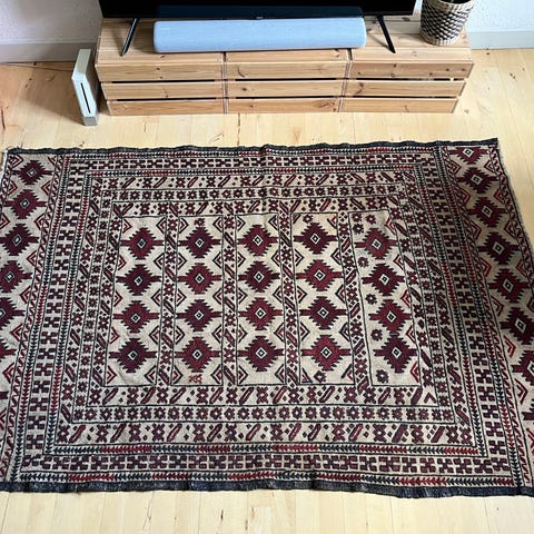 Ægte tæppe mørkeblå/rød mønstret med frynser