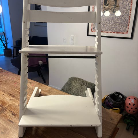 Stokke Højstol i hvid farve. Fremstillet i robust materiale med justerbare trinbrædder for tilpasning til barnets størrelse. Designet til børn og velegnet til brug ved spisebordet.