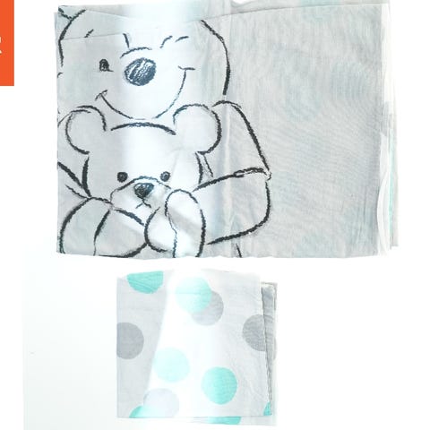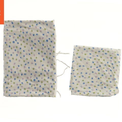 Dette sæt består af blåt sengetøj i to størrelser med et regndråbe mønster. De to dele måler henholdsvis 42x37 cm og 92x132 cm, ideelt til små senge eller barnesengetøj.