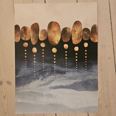 Akvarel med sten i gråt og brunt med guldrevner (ikke guldfolie) mod en lysegrå baggrund. Denne smukke poster er perfekt til et hjem, hvor du har lyst til at bruge monokrome farver, men med et tvist!