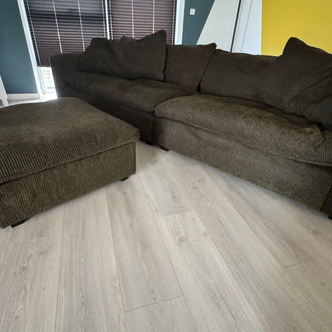 ILVA Heaven XL sofa + puf i en dyb, rolig flaskegrøn farve i fløjl. Store, fyldige sæde- og rygpuder sikrer, at man synker behageligt ned og bliver hængende – perfekt til lange afslappende aftener, læsehjørner eller filmdage.